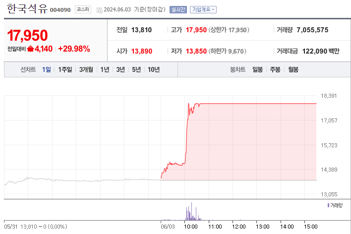 6월 3일 한국석유는 17,950원으로 장을 마감했습니다. 전일 대비 29.98% 올라 상한가를 기록했습니다. 동해안 석유 가스 탐사 시추 계획 승인에 따라 관련주가 급등세를 보인 것인데요, 내년 상반기까지는 매장 결과에 대한 기대감으로 점진적인 상승이 지속되지 않을까 생각됩니다.