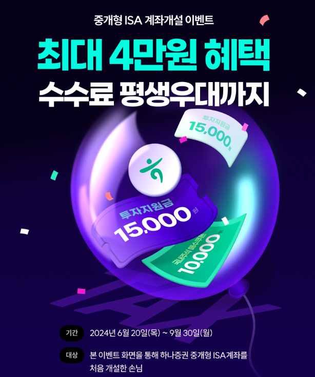 하나증권은 9월 30일까지 중개형 ISA 계좌개설 이벤트를 진행합니다. 하나증권에서 중개형 ISA 계좌를 처음 개설한 고객은 즉시 국내주식 매수쿠폰 1만원을 제공받고 계좌개설 후 3영업일 이내에 투자 지원금 15,000원을 추가로 받을 수 있습니다.