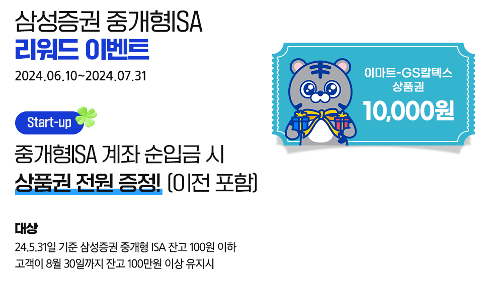 ✔️ Start-up이벤트 : 중개형 ISA 계좌 잔고가 100원 이하인 고객이 100만원 이상 1,000만원 이하를 입금 시 이마트, GS칼텍스 상품권 1만원 지급