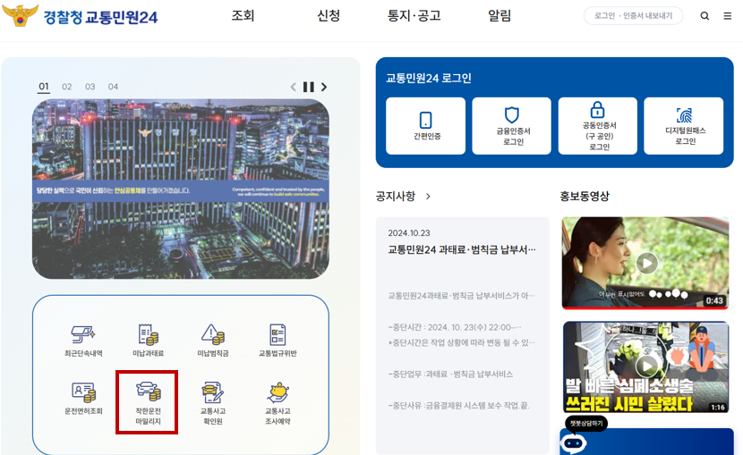 온라인 신청은 경찰청 교통민원 24 홈페이지에서 화면 중앙에 보이는 "착한운전 마일리지" 메뉴를 클릭하면 됩니다. 이후 본인 인증 절차를 진행한 후, 내용을 확인하고 신청을 완료하면 됩니다.
