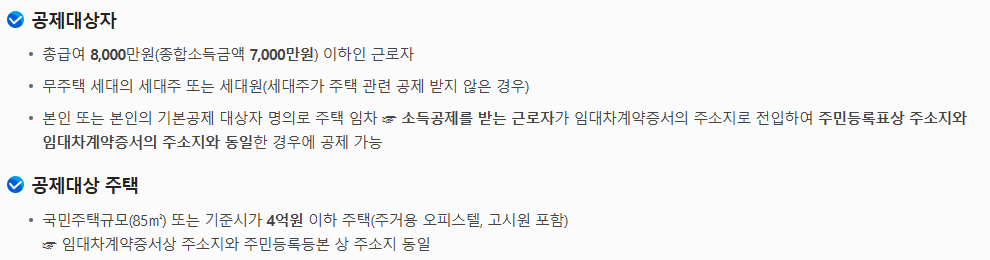 자세한 자격 조건은 국세청 홈페이지에 자세히 나와있기 때문에 내가 공제 대상이 맞는지 확인하고자 하신다면 국세청 홈택스에서 직접 확인해 보시기 바랍니다.