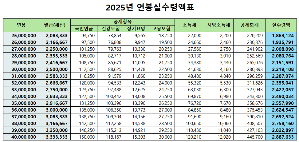 2025년 연봉 실수령액 표가 필요하신 분은 아래 파일을 받아가세요😊