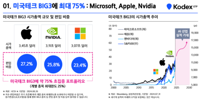 애플, 마이크로소프트, 엔비디아와 같은 글로벌 빅테크 기업이 주요 포트폴리오를 구성하고 있으며, AI, 반도체, 클라우드 컴퓨팅 등 미래산업을 선도하는 기업들로 이루어져 있습니다.