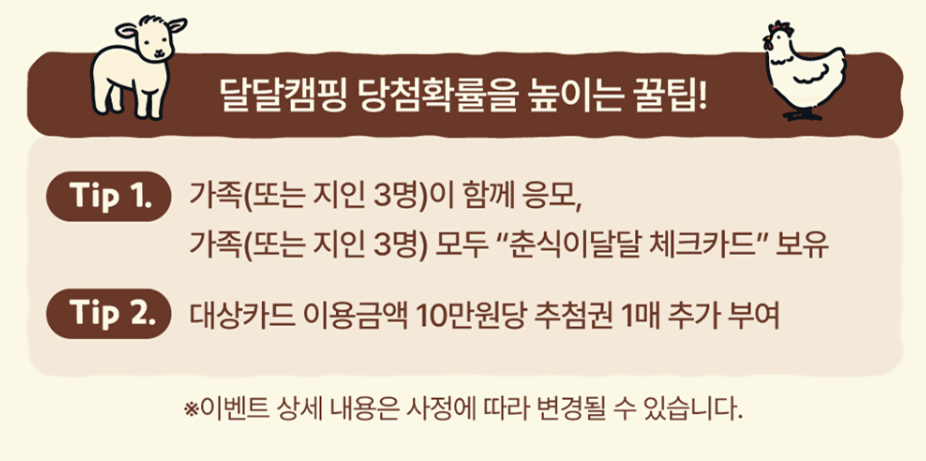 당첨 확률을 높이는 방법으로는 춘식이 달달 체크카드를 보유한 팀으로 구성해서 응모하면 당첨 확률이 높아진다고 합니다. 다같이 체크카드를 발급 받고 이벤트에 응모하면 당첨 확률이 높아질 것 같습니다.