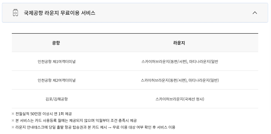 전월실적이 50만원 이상이라면 연 1회 인천공항 또는 김포/김해공항 라운지를 이용할 수 있습니다. 해외 출국이 잦으신 분이라면 라운지 이용 혜택을 받아가시면 좋을 것 같습니다.