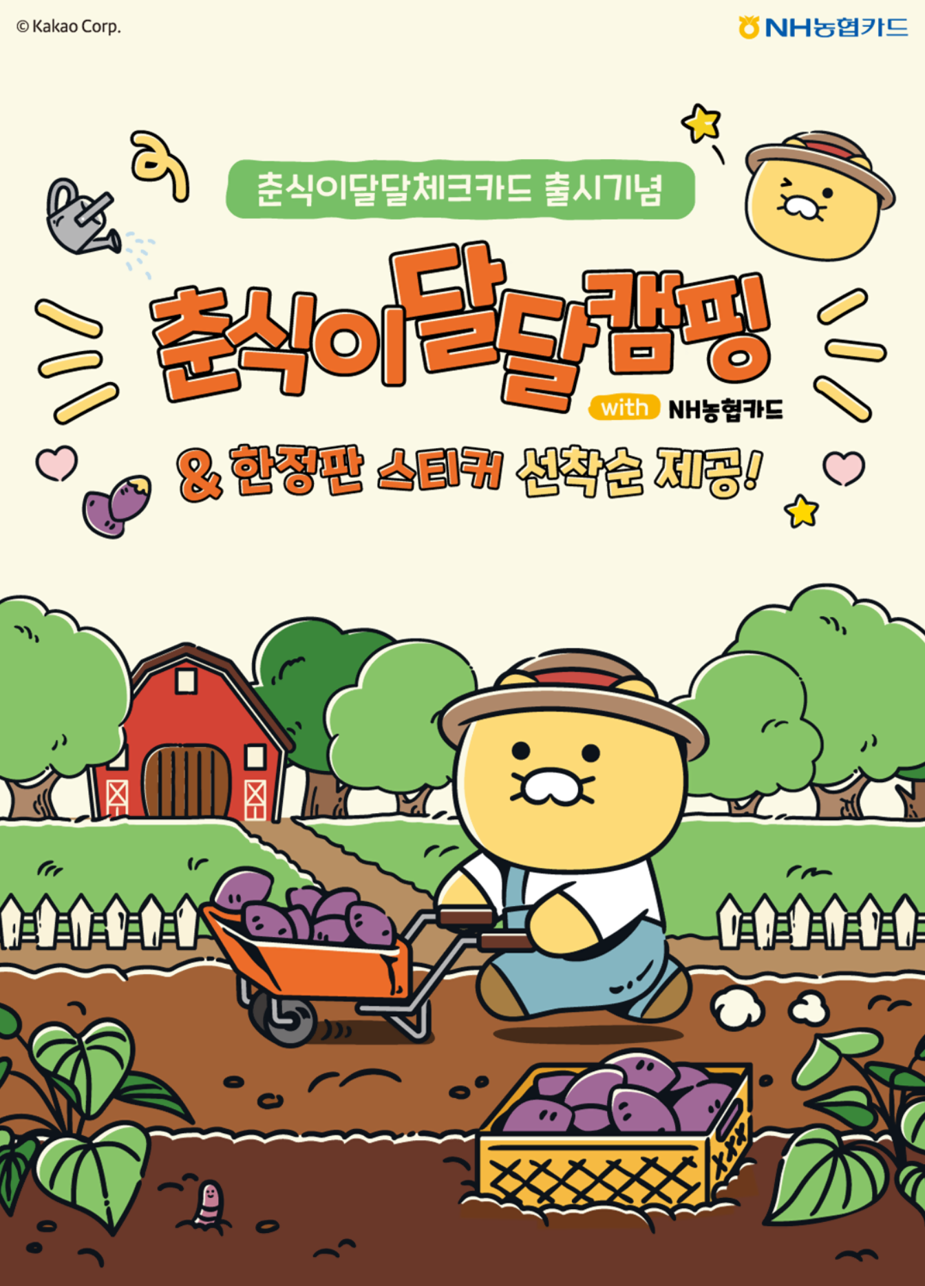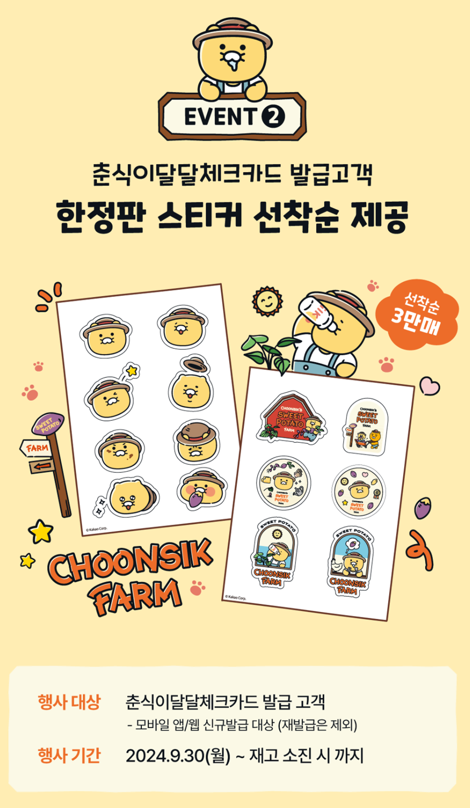 캠핑 이벤트 뿐만 아니라 춘식이 달달 체크카드 발급고객에게 한정판 스티커를 선착순으로 제공하는 이벤트도 함께 제공한다고 합니다.