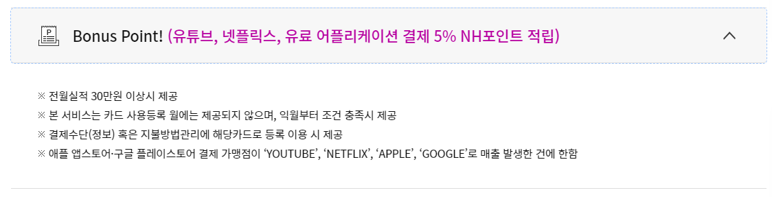 뿐만 아니라 유튜브, 넷플릭스, 유료 어플리케이션 결제 시 5%의 NH포인트가 적립되기 때문에 유료 OTT를 이용하고 계시다면 춘식이 체크카드를 이용하셔서 포인트 적립도 받아가시면 좋을 것 같습니다.