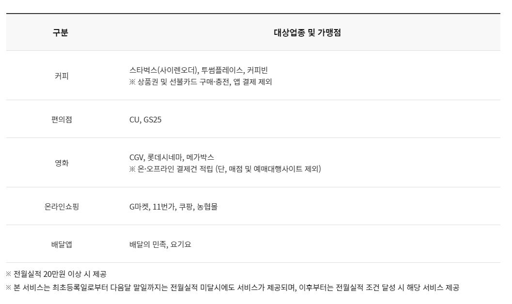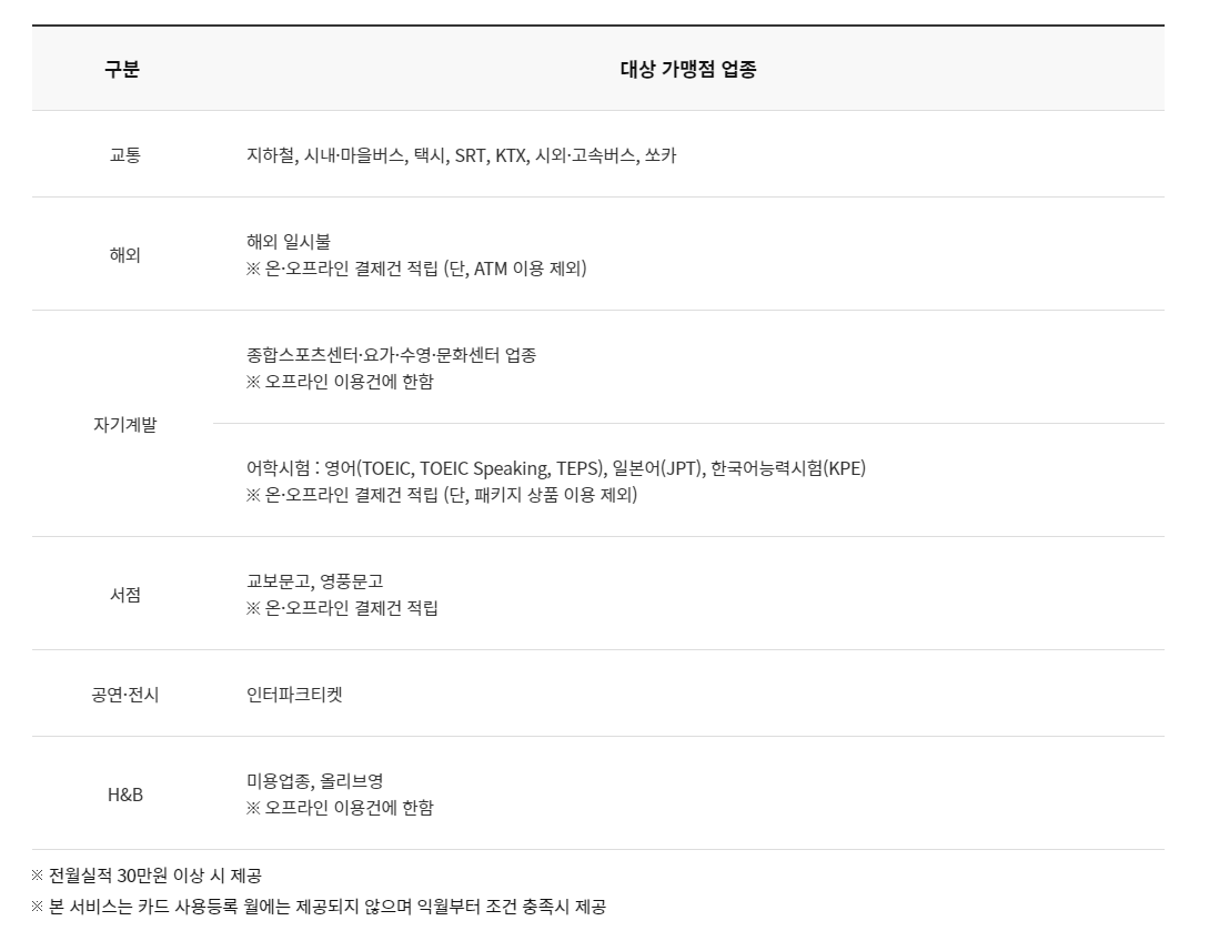 또한 전월 실적이 30만원 이상이면 교통, 해외 일시불, 자기계발, 서점, 공연 및 전시, H&B에서 사용하면 요일 상관없이 1.5% 포인트가 적립됩니다.