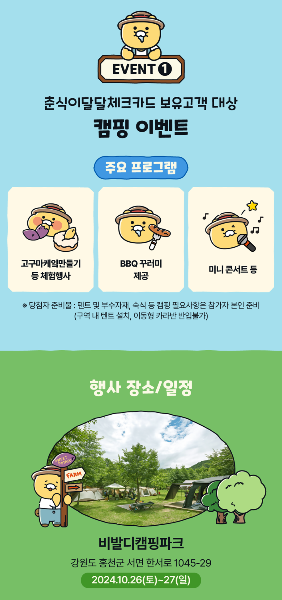 춘식이 달달 체크카드 보유 고객 중 추첨을 통해 비발디 캠핑 파크에서 진행되는 캠핑에 참여할 수 있습니다. 캠핑을 좋아하시는 분이라면 좋은 이벤트가 될 것 같습니다.